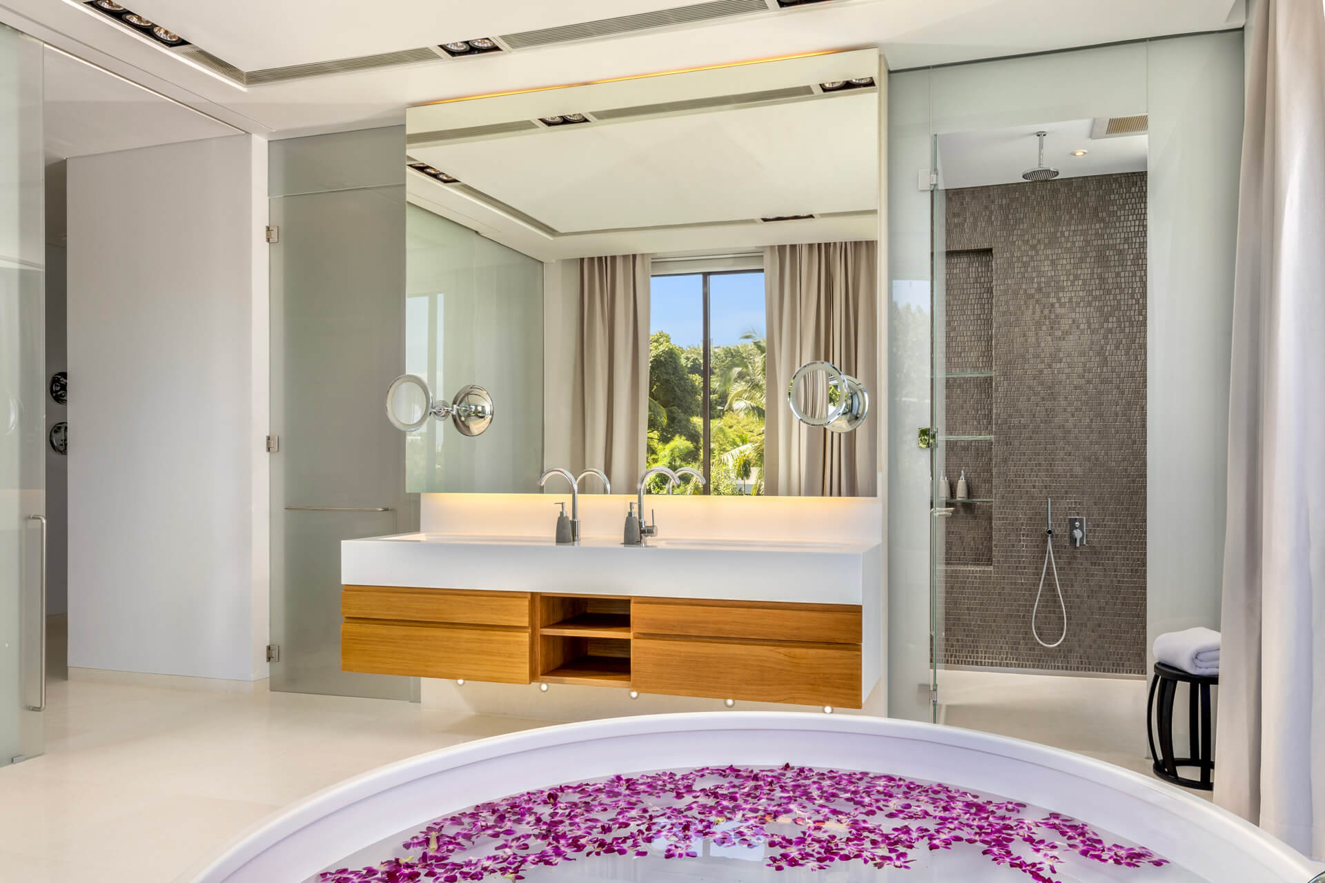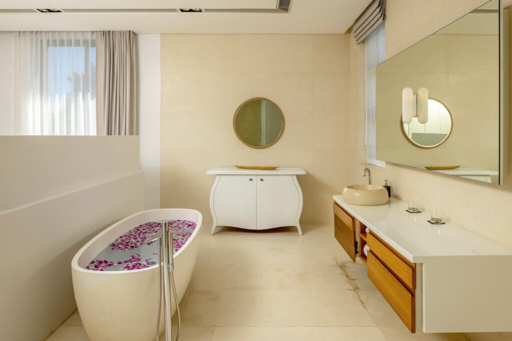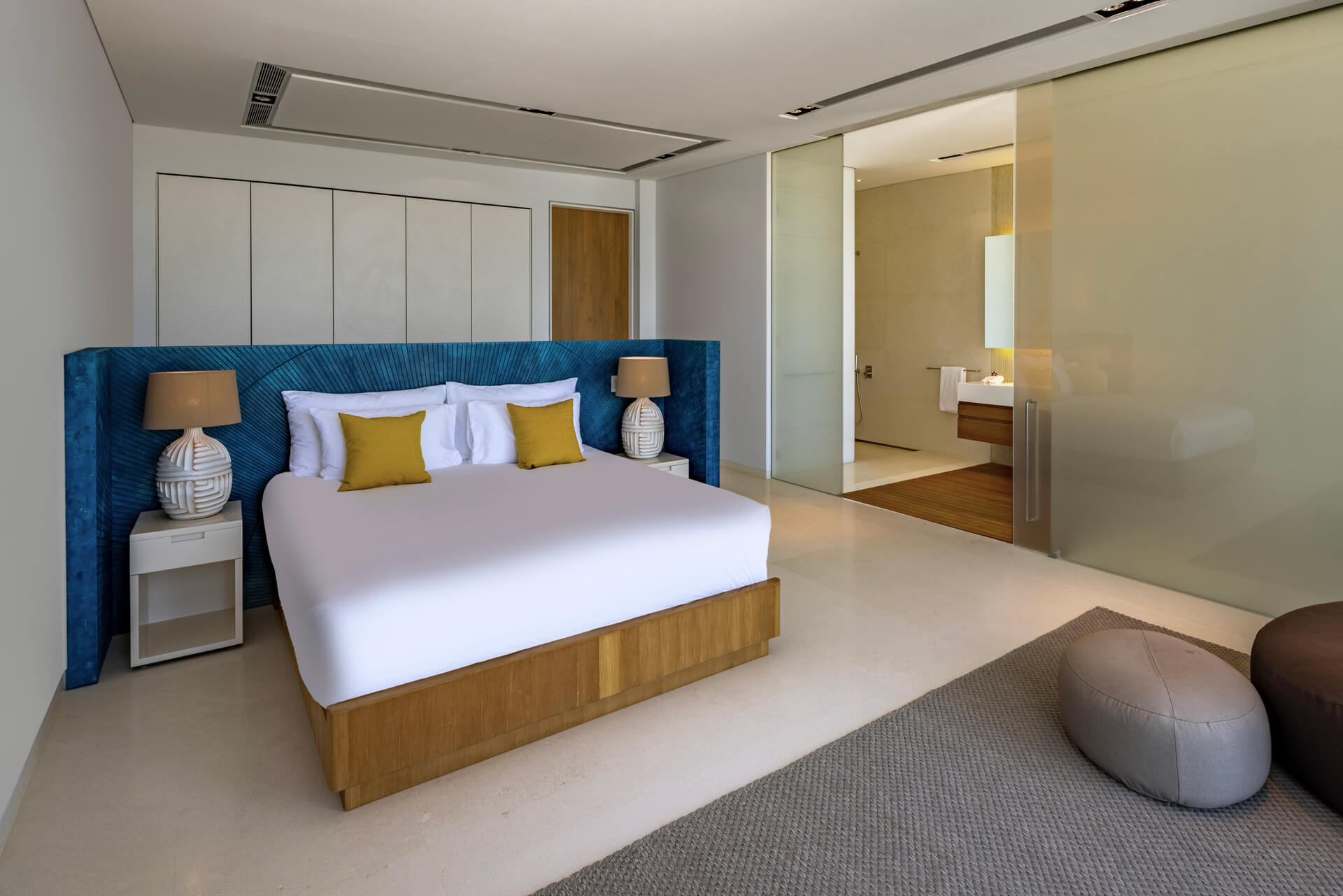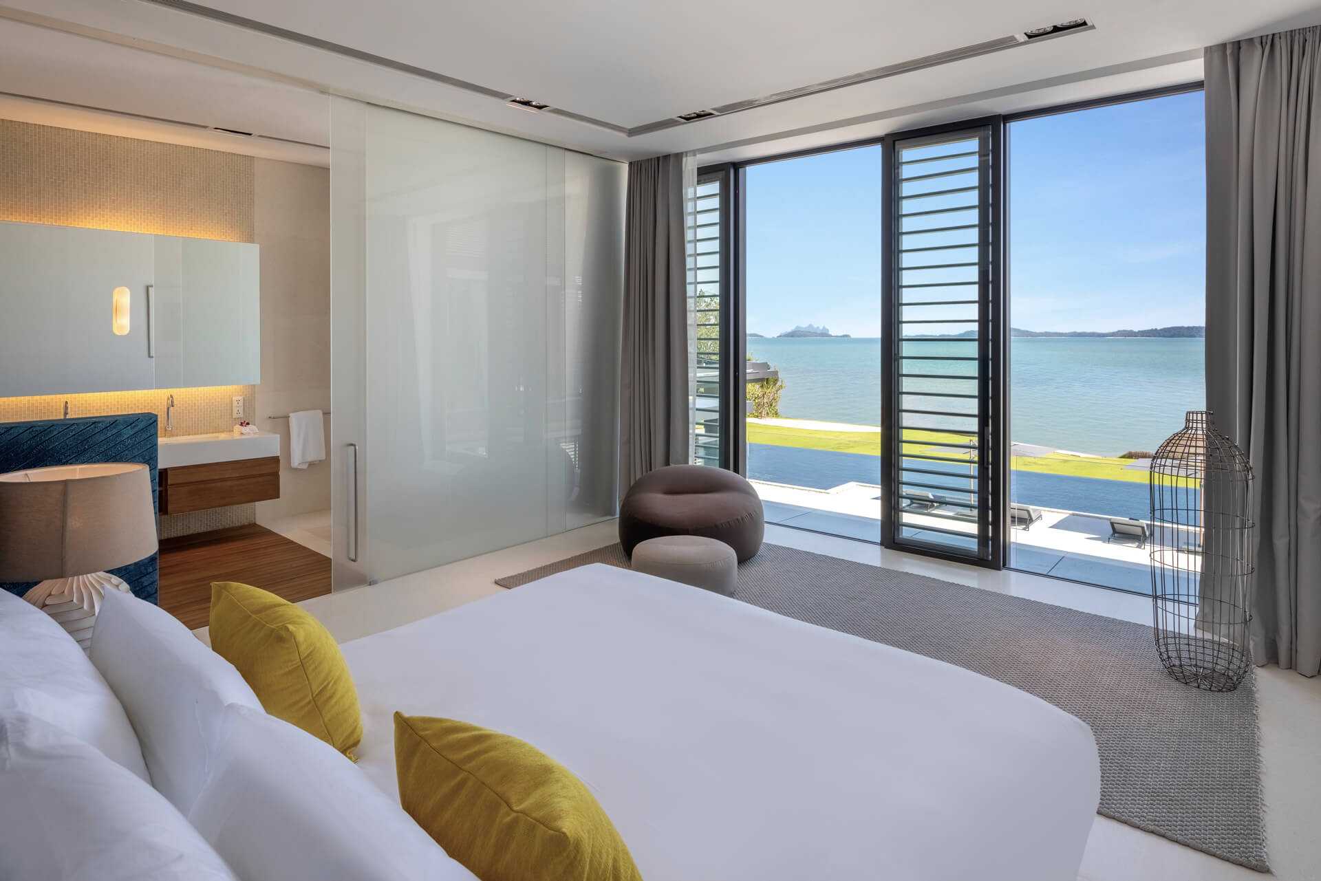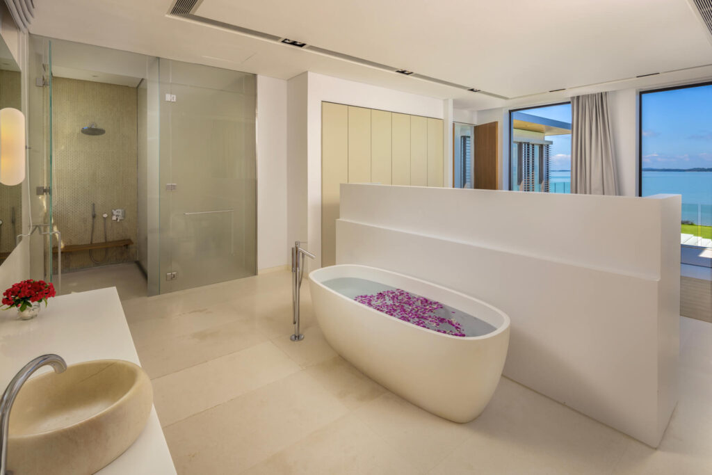 The Master Bedroom (132 sqm) offers a serene sanctuary with a king-size bed, panoramic sea and pool views, and a walk-in closet. It features a work desk for two, a 40-inch flat-screen TV with Apple TV and DVD player, and both air conditioning and a ceiling fan. The ensuite bathroom is fitted with double vanities, a bathtub, a rain shower, and a separate toilet, complemented by luxury amenities including toiletries, bathrobes, slippers, a hairdryer, and umbrellas.
