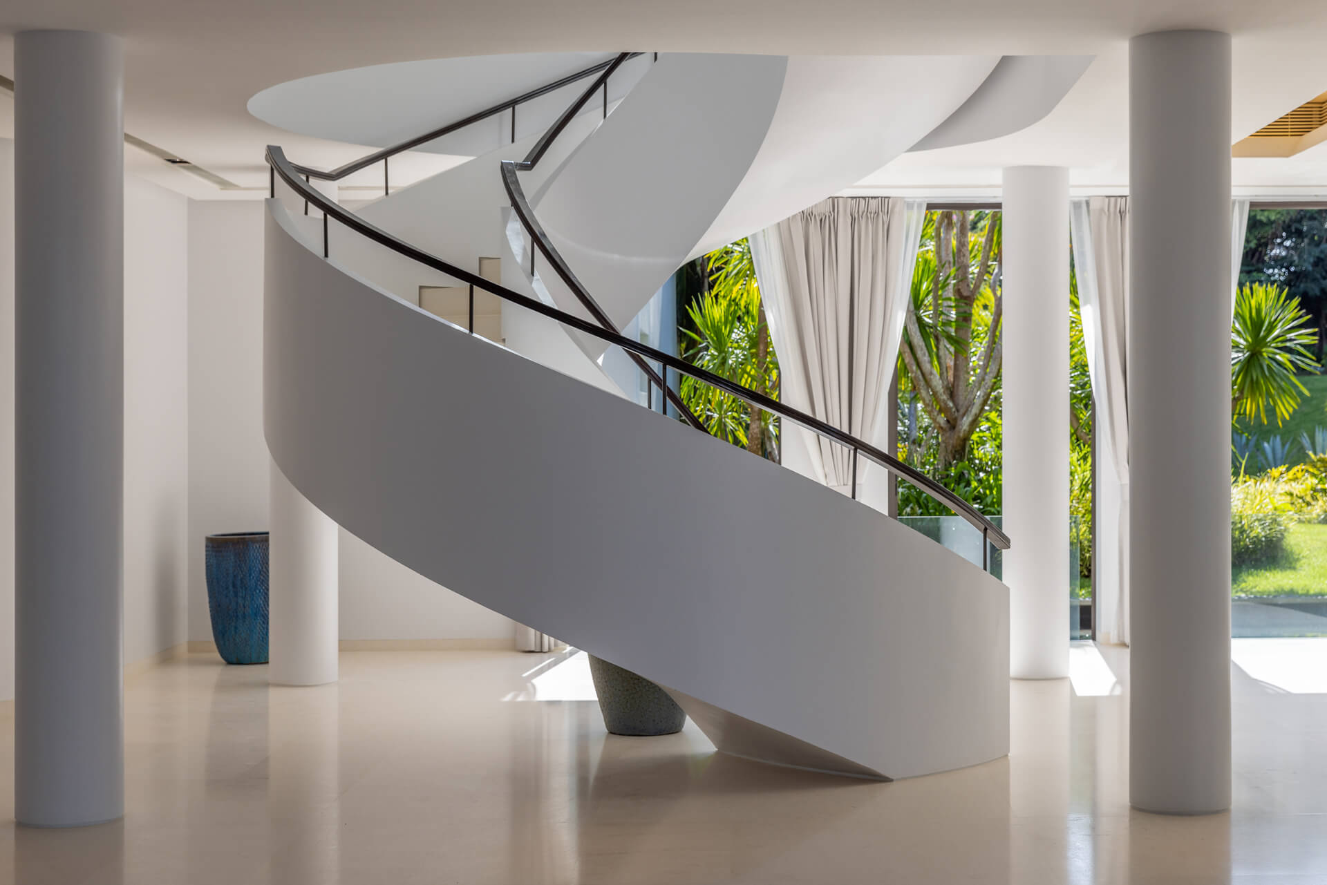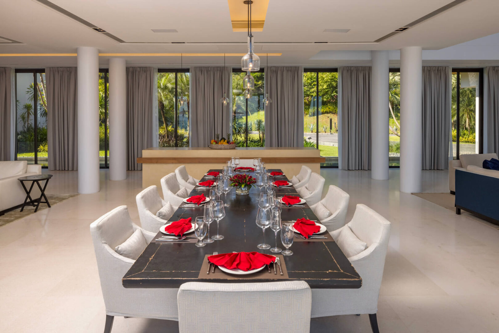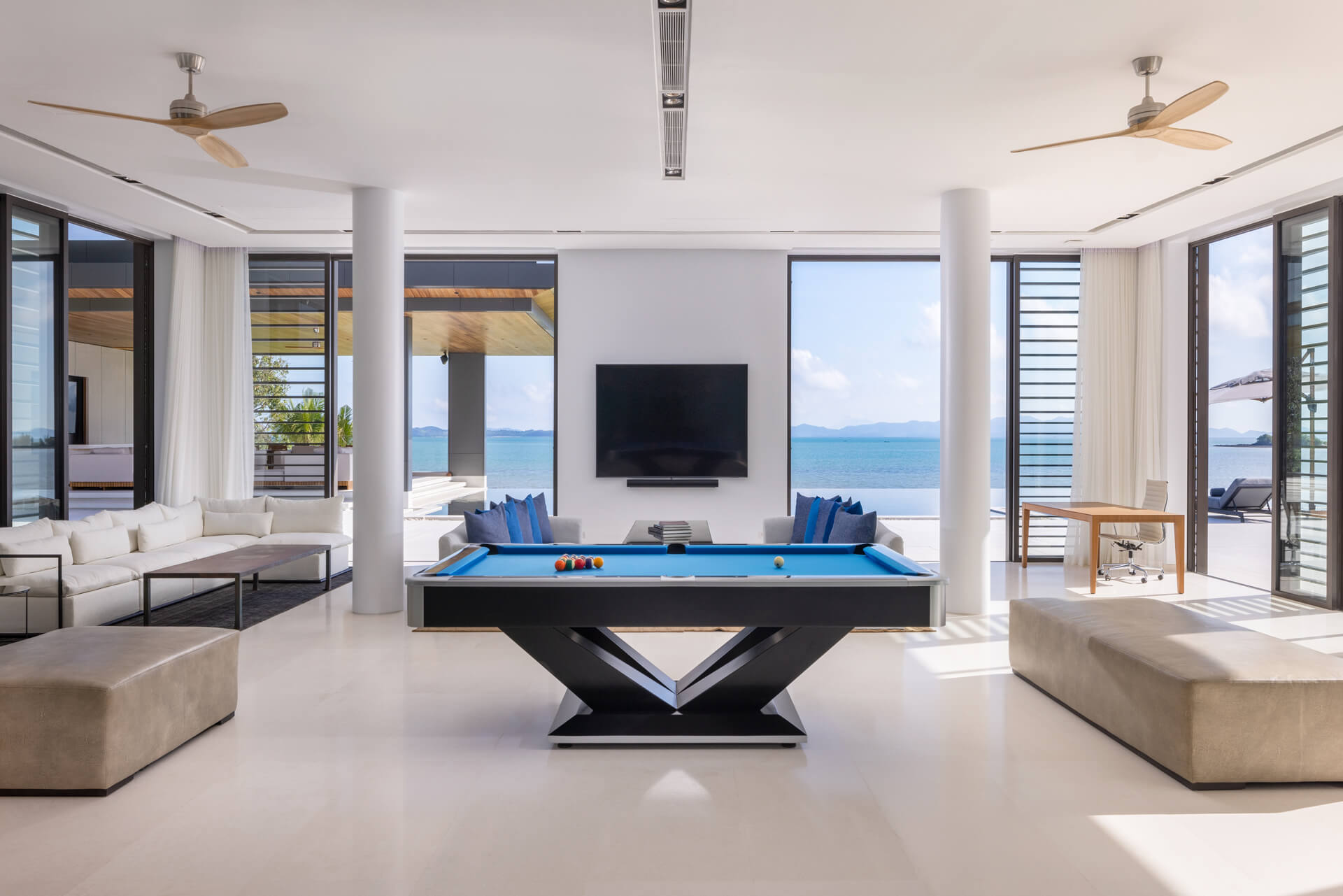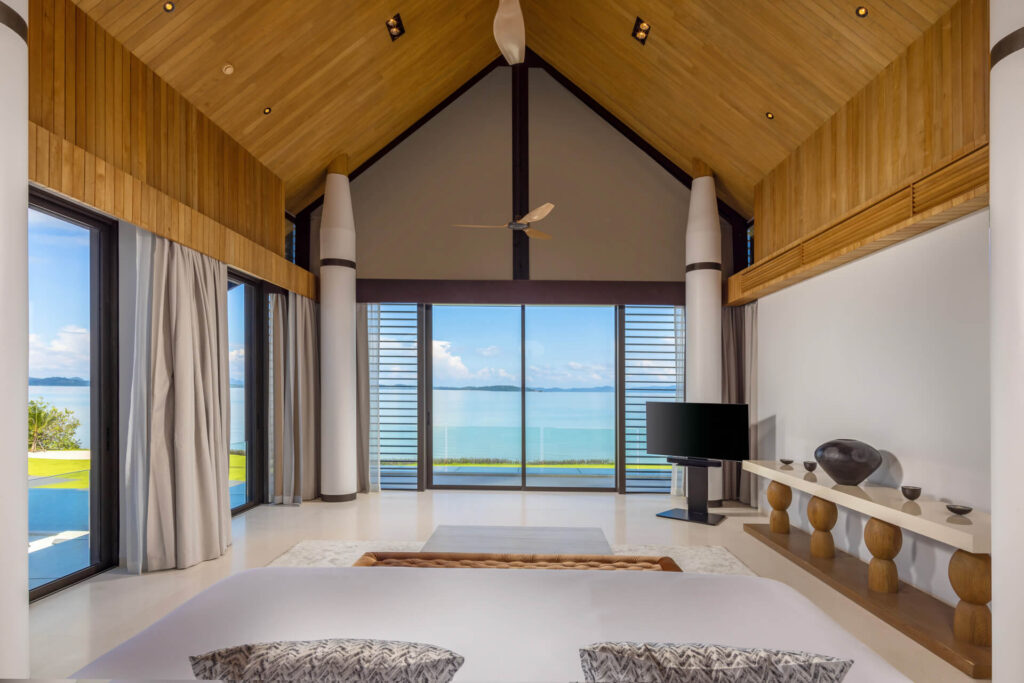 The villa’s design harmonizes modern minimalism with traditional Thai architecture, highlighted by its elegant pointed roofs and sleek, open interiors. Inside, guests are welcomed into a bright and spacious living area adorned with marble Buddha statues, contemporary art, and comfortable lounge seating, all overlooking the endless sea.