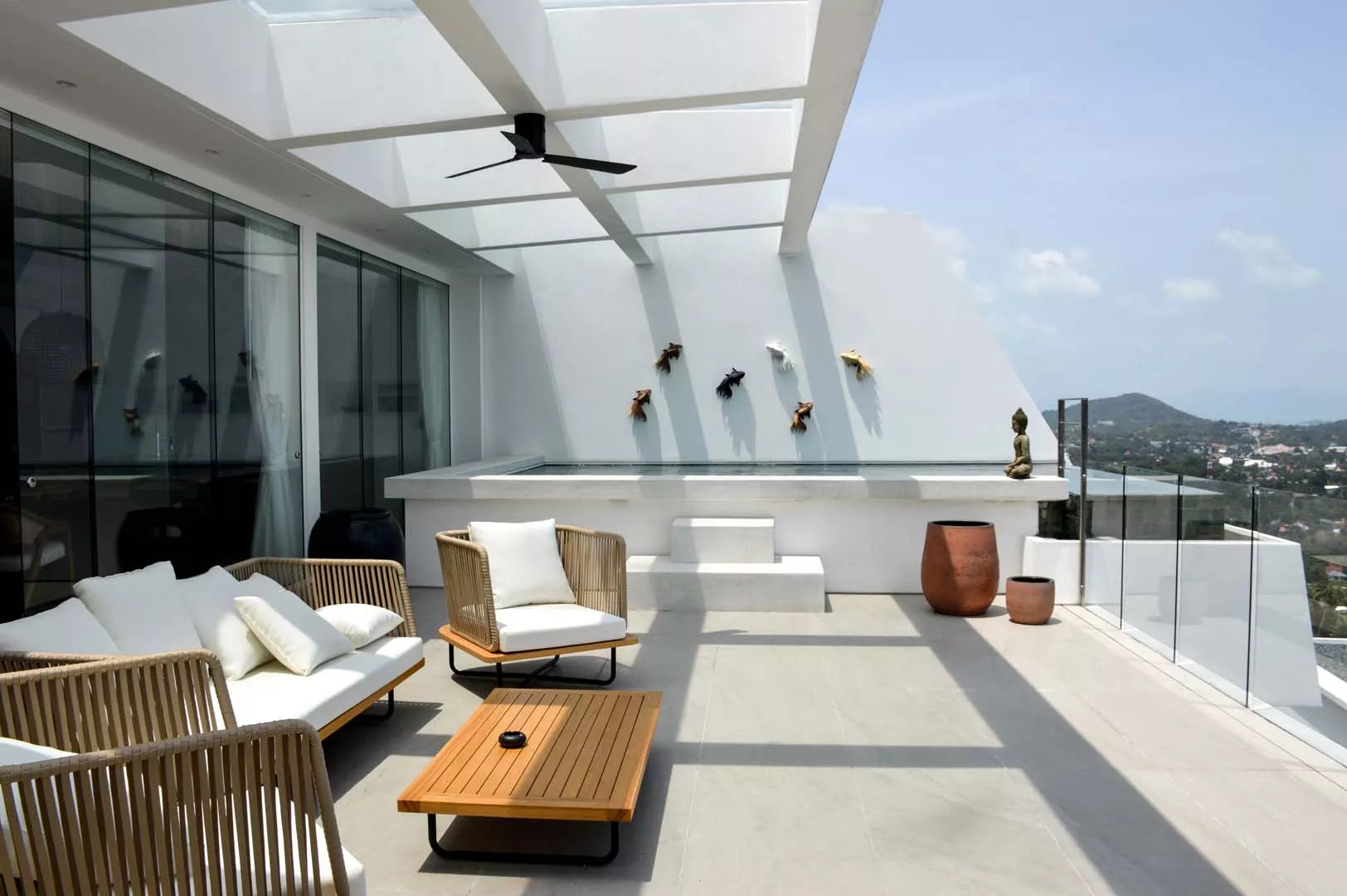 Upper terrace with a plunge pool, sun loungers, and bean bags