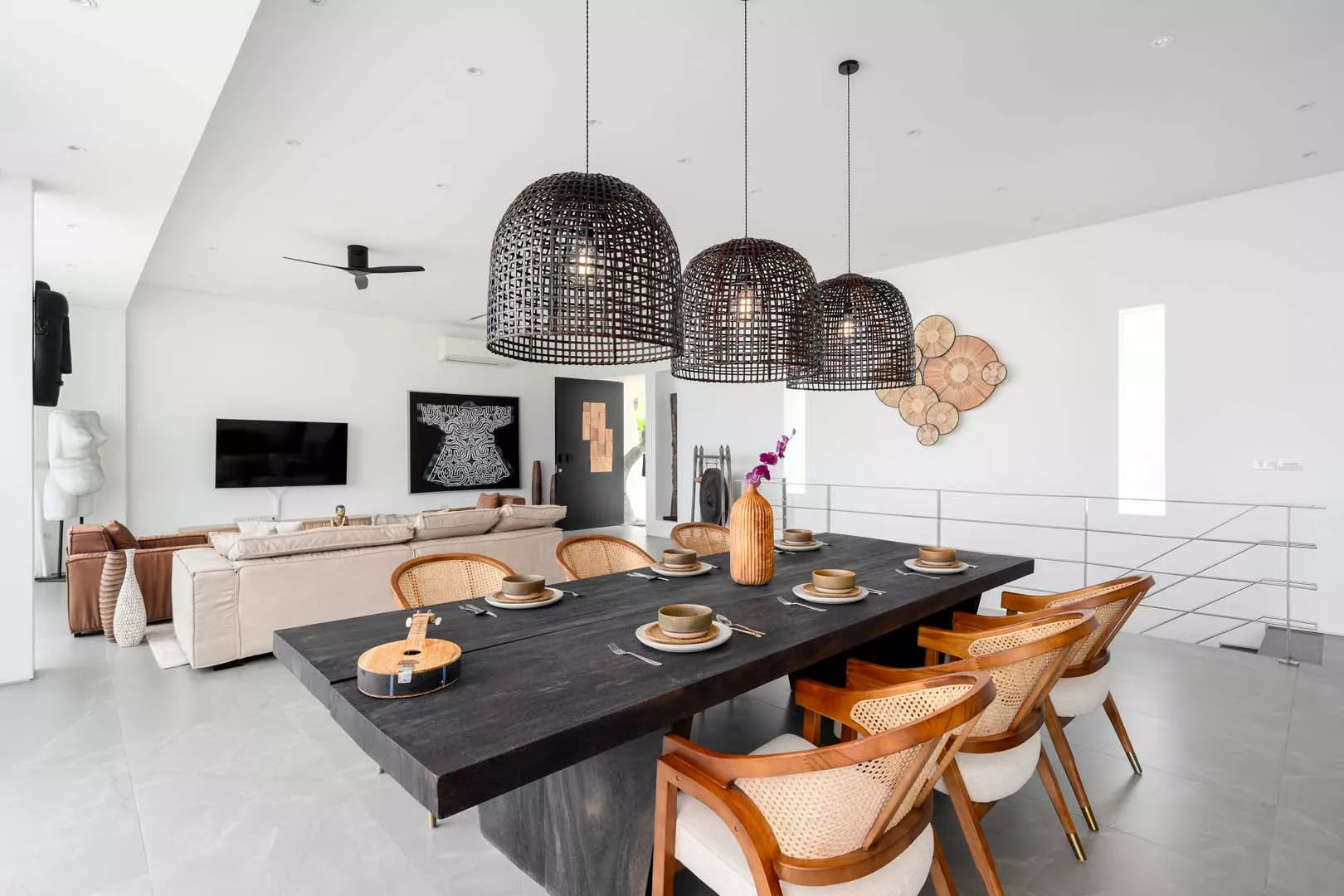 Living Areas: Large living room on the main level; sliding glass doors; endless sea views; sofas for television viewing; well-equipped open kitchen; breakfast island and three bar stools; eight-seater dining table; large balcony outside the living room with a private plunge pool, seating and sun loungers; common balcony on the bedroom level; powder room; art and eclectic sculptures.