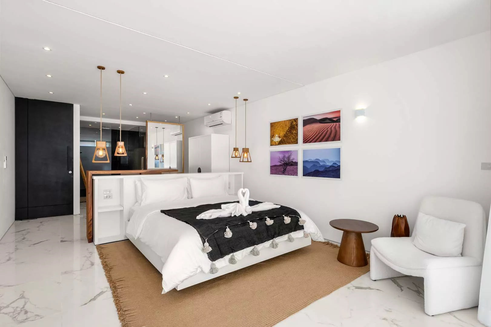 On the lower level, three ensuite bedrooms with king-size beds open onto a shared balcony with swings and armchairs — a dreamy spot for morning coffee overlooking the sea.