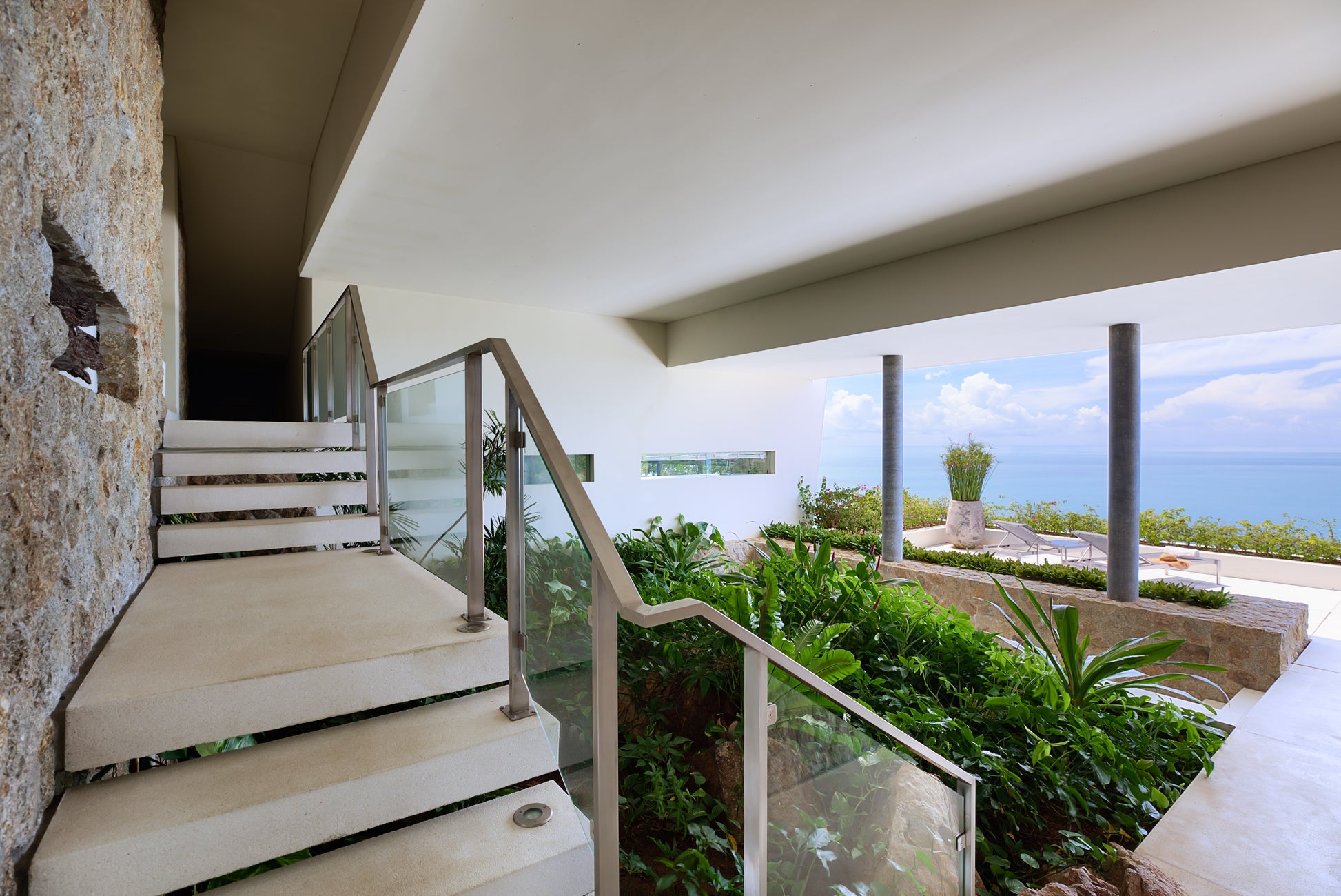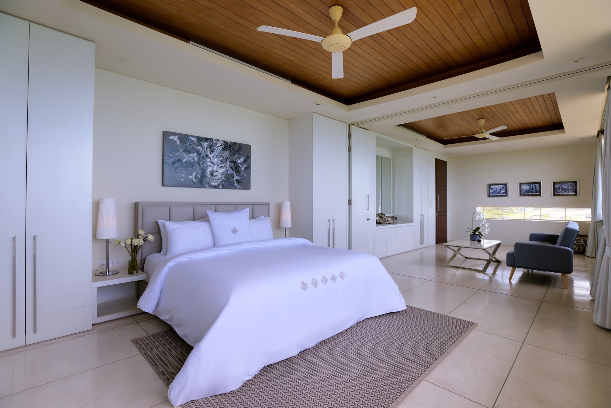 Five elegant double bedrooms — three King and two Queen — offer exceptional comfort, sea views from the bed, and private en-suite bathrooms. Two master suites feature luxurious indoor–outdoor showers and twin vanities.