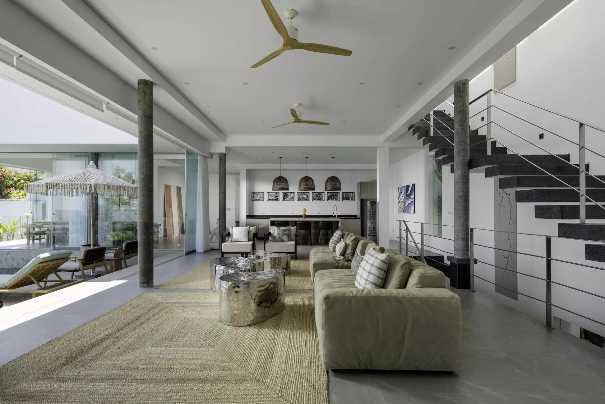 Living Areas: Large living room on main level with two sides glass doors; sofa seating; open kitchen with island and three bar stools; long dining table with 12 seats; additional living room on top floor with sofa seating; fully equipped gym; game room with pool and foosball; home cinema; spa room; outdoor terraces; poolside sala; outdoor dining with 12 seats; art and sculptures; pool deck and terrace with loungers and sun umbrellas.