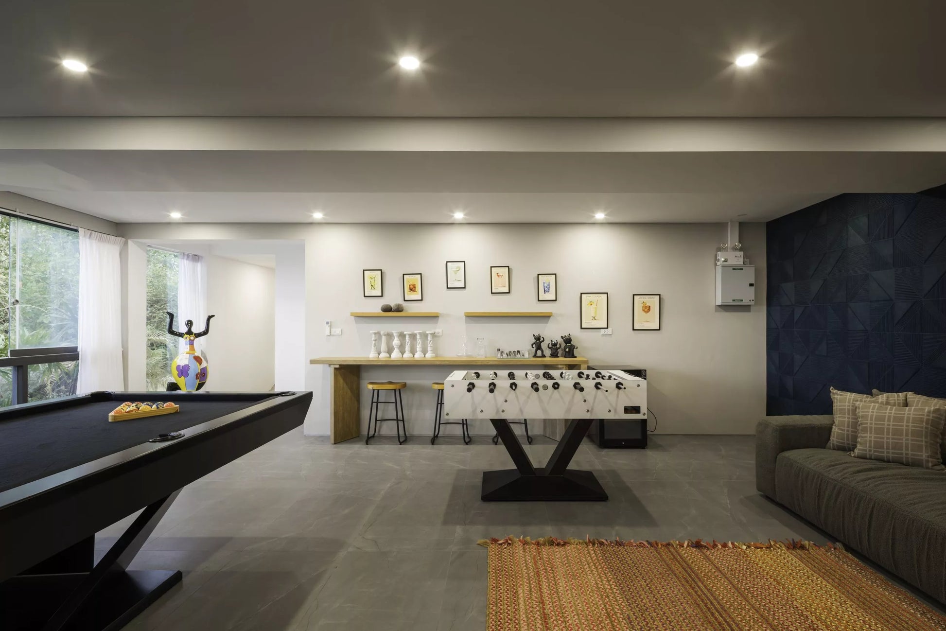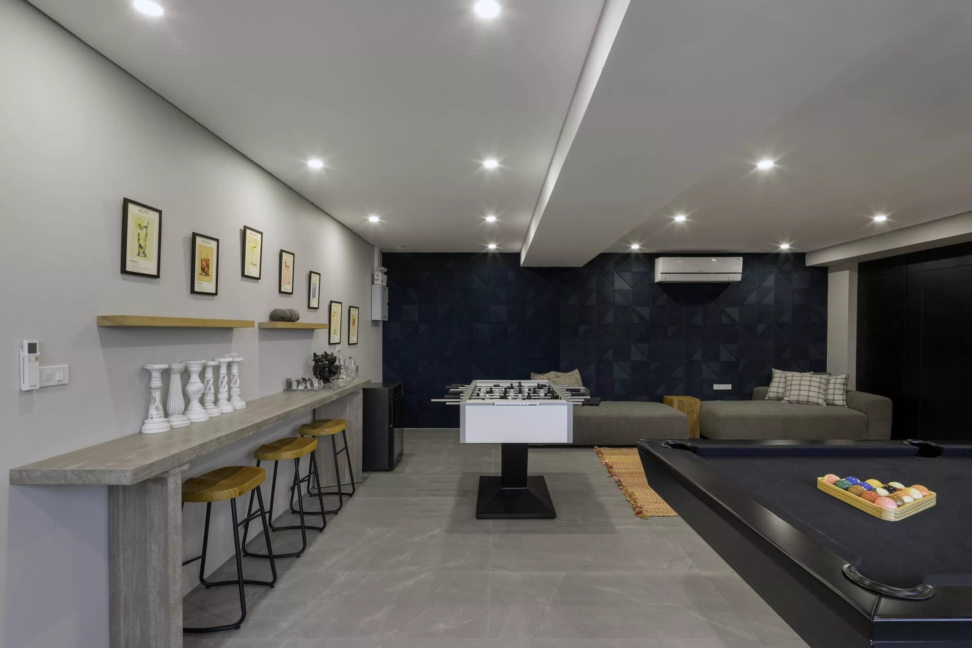 Lower levels: gym, modular spa, family bedrooms, and an entertainment zone with pool table, bar, foosball, and private cinema.