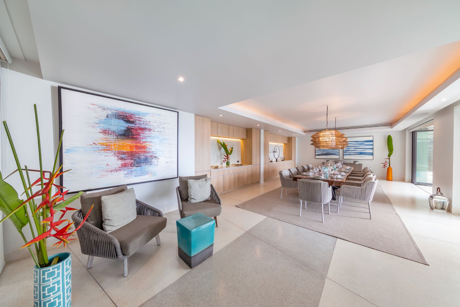 Blending traditional Thai architecture with calm, contemporary interiors, the villa showcases neutral tones, white walls, and soft blue accents. Each bedroom is thoughtfully appointed with king-size beds, Smart TVs, minibars, and luxury amenities, including a unique duplex room with flexible bedding.
