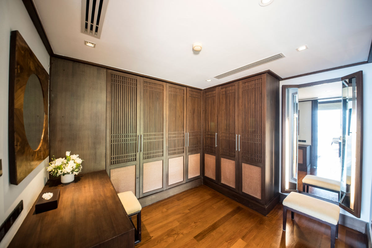 A cozy garden-view room with king-size or twin beds, lounge area, work desk, and His & Her closets. Features air conditioning, safety box, and an ensuite bathroom with bathtub, shower, and vanity.